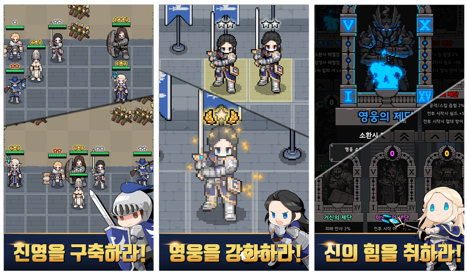 고전게임 감성의 도트 그래픽 속에서 내가 키운 영웅들이 적과 펼치는 전투를 지켜보는 재미가 있습니다. 영웅 레벨업과 영웅 간의 합체를 통해 더욱 강력한 팀을 만들어 새로운 스테이지에 도전하는 맛이 쏠쏠합니다.